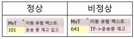 문의 내역을 파악하는 도중 정상적이라면 이동유형이 101이어야하지만 이동유형이 641로 처리되어 입고처리가 되지않은 상태로 보여진 것이다.