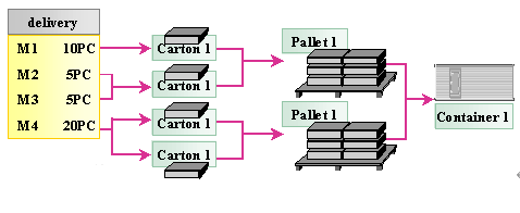 아래 그림은 Delivery note의 item을 carton에 포장하고 (1Carton = 10 PC) 이를 다시 pallet에 담는다. (1Pallet = 2 Carton)