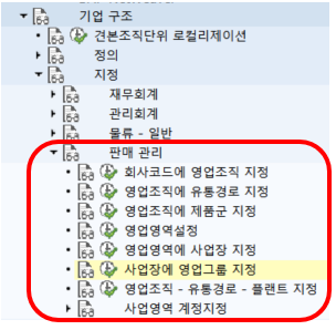 기업구조의 하위트리에서 SD와 관련된 세팅은 판매관리 아래에 있다.