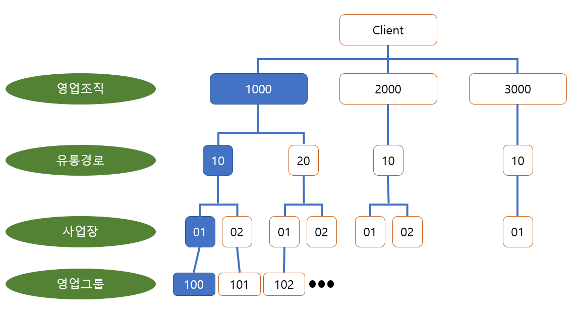 영업조직, 유통경로, 사업장, 영업그룹을 기준으로 각각의 항목들을 연결해주는 것이다.