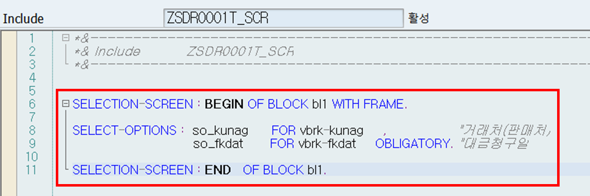 SCR INCLUDE의 역할은 SELECTION SCREEN 즉 조회조건을 만드는 역할이다.