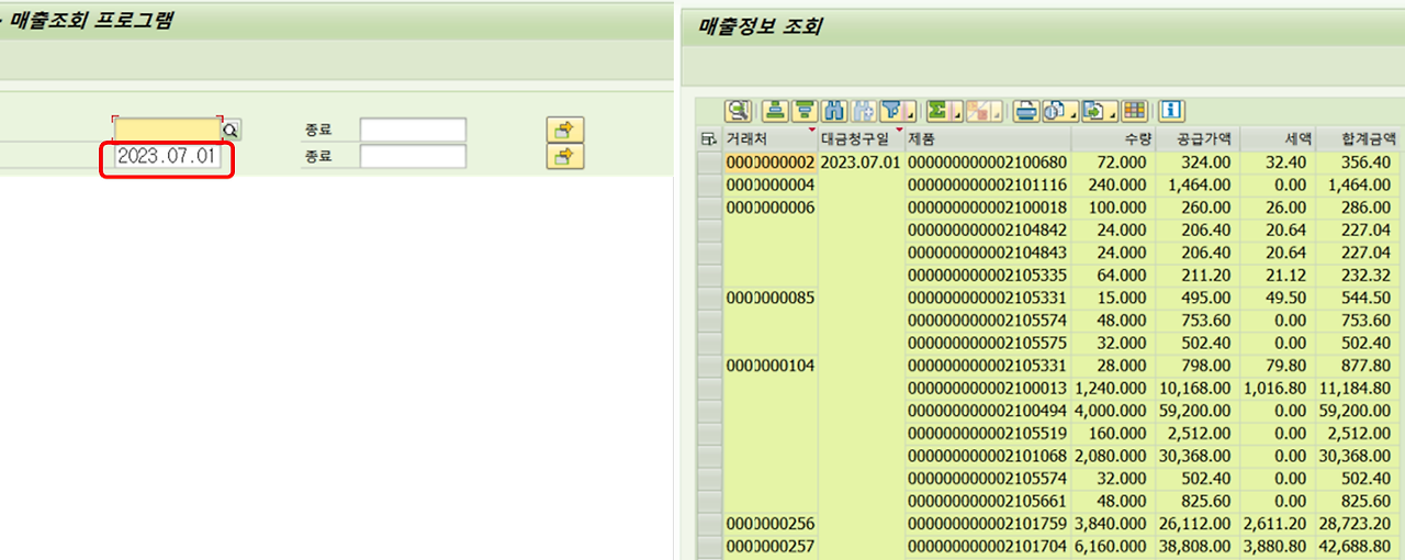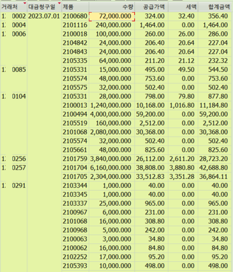 결과화면을 보면 거래처코드, 제품코드는 총 7자리로 구성해놓았다. ( 회사마다 다를 수 있음 )