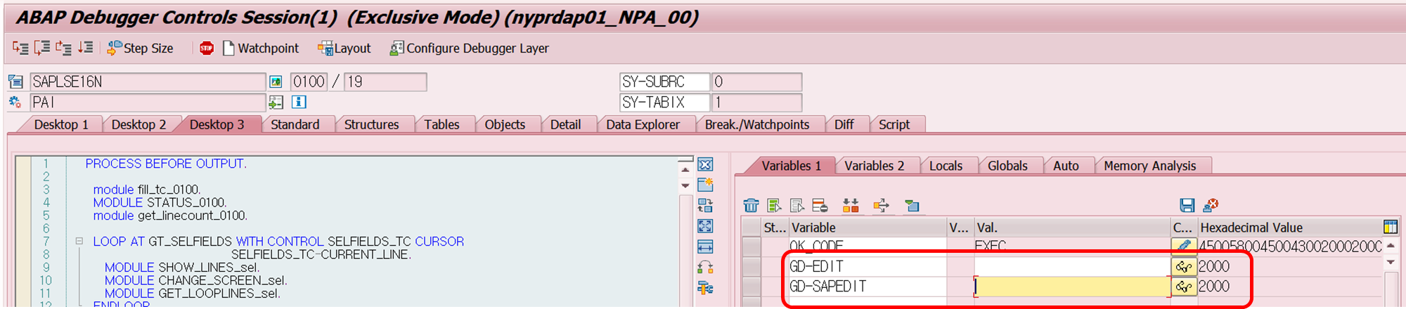 5. 디버깅 화면에서 GD-EDIT, GD-SAPEDIT를 입력하고 둘다 X의 값을 입력해준다.