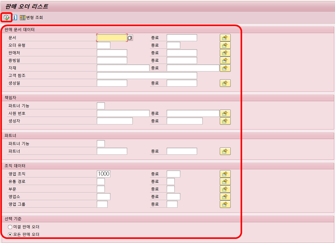 판매문서 번호를 직접 입력해도되고, 원하는 조건을 입력하여 다량의 판매문서를 조회할 수 있는 화면이다.